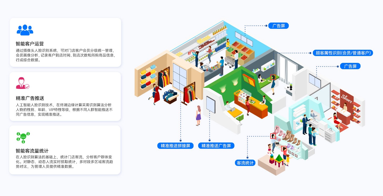 非凡娱乐GDSM-ES智能零售管理系统还可实现宣传推广内容的精准推送,高效触达。系统融合人工智能技术,采用专业的人脸识别算法,通过终端接入摄像设备与AIOT设备,自动识别不同的物体、动作和行为,形成人物画像,为广告屏幕的内容推送提供数据支持,实现精准营销。同时还可以提供客流统计和客群分析功能,为零售客户提供精准的门店数字化运营管理方案。