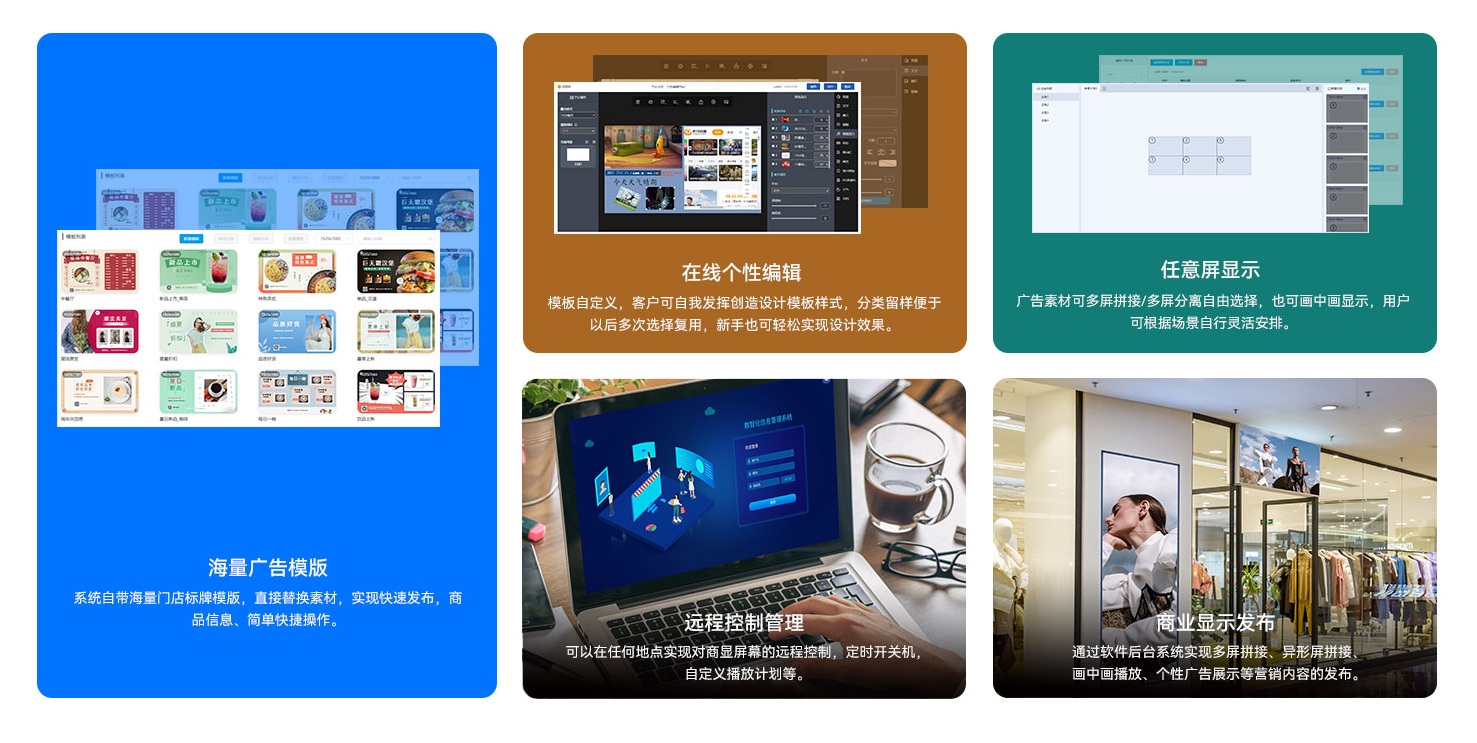 非凡娱乐科技为客户提供可靠的硬软云一体化服务,针对商显领域,除了为客户提供数字标牌等硬件产品,同时也自主研发了非凡娱乐GDSM-C数字化信息发布管理系统软件,作为全方位的远程信息编辑发布及设备管理系统,提供丰富广告素材与人性化编辑工具,用户可发挥自我创造能力,新手也可轻松实现大师设计效果,同时可实现多屏拼接/分离、画中画等自由选择,可根据应用场景灵活安排,满足大型会议、百货商场、体育赛事、金融证券的等多种智能显示需求。